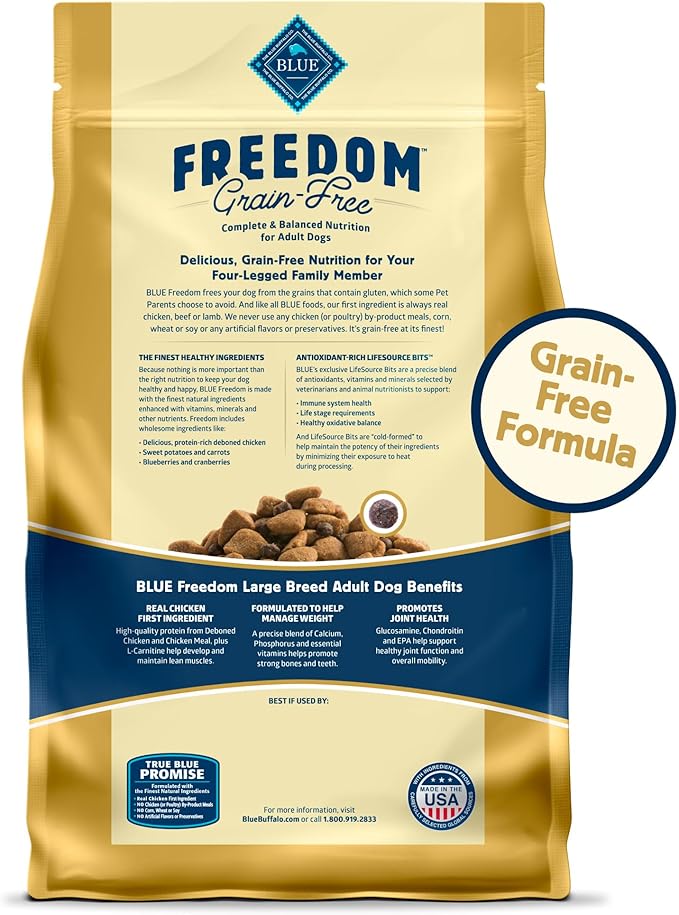 • Contains: One (1) 24-lb. bag of BLUE Freedom Grain-Free Dry Dog Food, Chicken Recipe