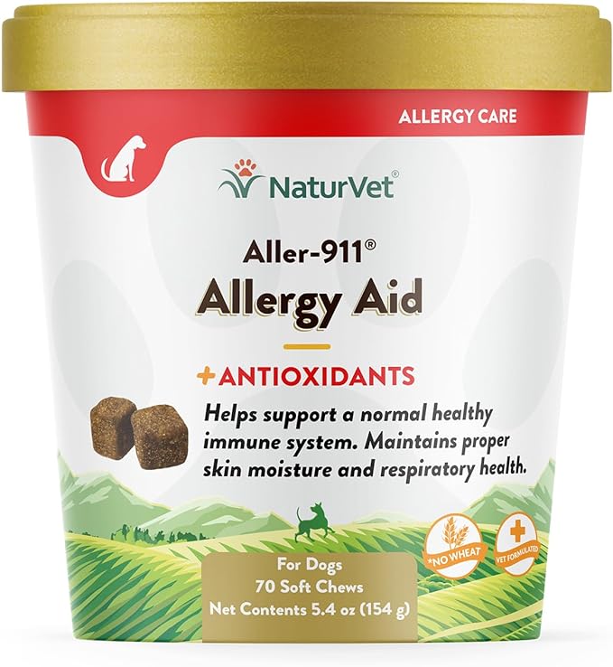 NaturVet Aller-911 Advanced Allergy Aid for Dogs, Cats – Antioxidant-Rich Pet Supplement with Omegas, DHA, EPA – Helps Support Dog Immune System, Cat Respiratory Health, Skin Moisture 70 Soft Chews