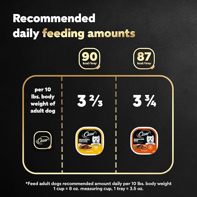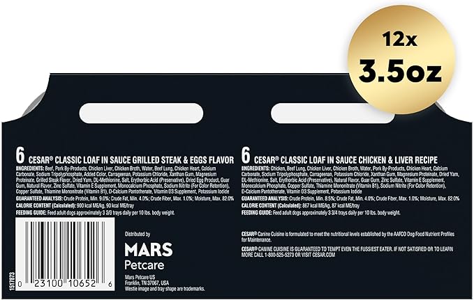 • Contains twelve (12) 3.5 oz. easy peel trays of CESAR Wet Dog Food Classic Loaf in Sauce Breakfast and Dinner Mealtime Variety Pack