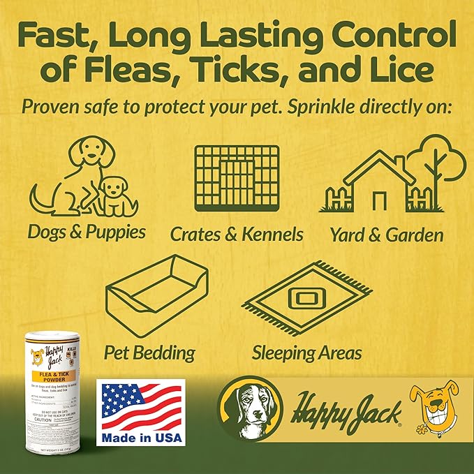 Happy Jack Flea and Tick Powder for Dogs & Puppies, Flea Powder for Carpets, Flea Treatment & Control, Kills Fleas, Ticks & Lice, Odorless & Non-Staining, Dust on Sleeping Quarters & Furniture (5 oz)