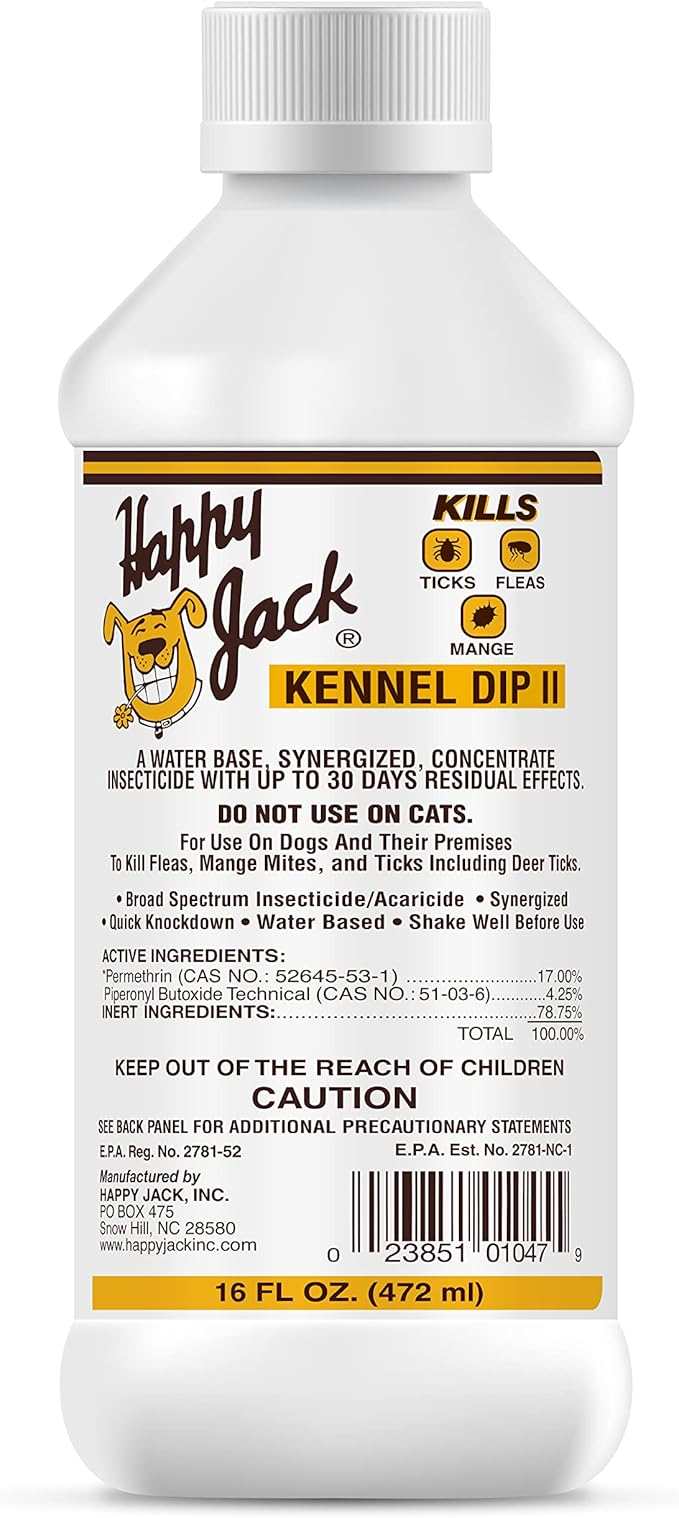 Happy Jack Kennel Dip Dog Flea and Tick Treatment & Prevention, Made in USA, Spray Yard & Home 30-Day Control, Kills Fleas, Ticks, Deer Ticks, Mange, Lice, for Puppies, Small to Large Dogs (16 oz)