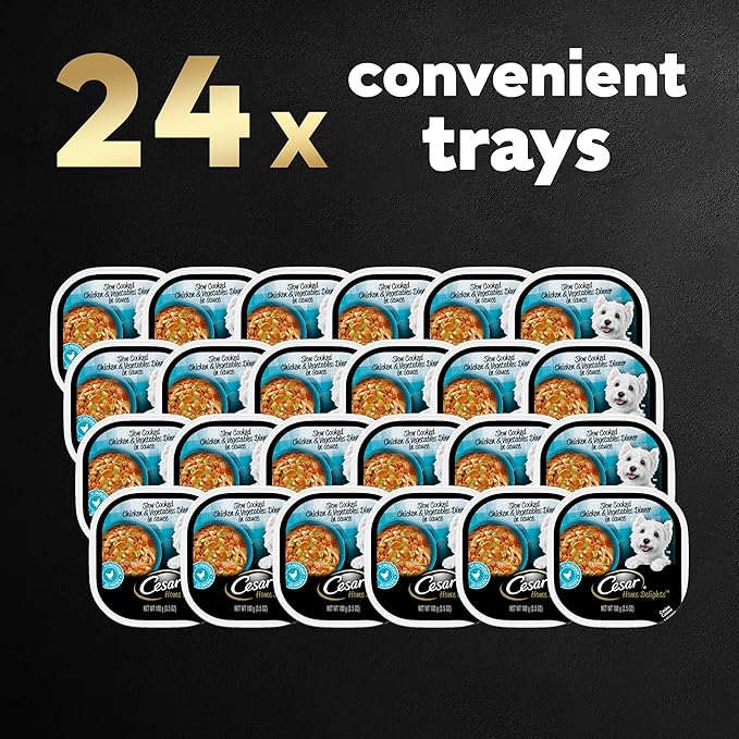 • 24-Pack: Contains twenty-four (24) 3.5 oz packs of CESAR HOME DELIGHTS Adult Wet Dog Food Slow Cooked Chicken & Vegetables Dinner in Sauce