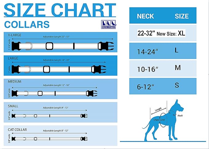 • Our officially licensed collars fit every shape and size. Measure your dog's neck according to the size chart in the image. Small: 3/8" Wide X 8-12" Long, Medium: 5/8" Wide X 12-18" Long, Large: 1" Wide X 18-28" Long