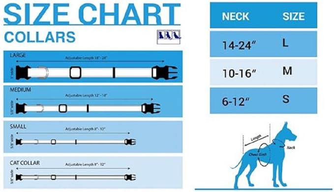 • Our officially licensed collars fit every shape and size. Measure your dog's neck according to the size chart in the image. Small: 3/8" Wide X 8-12" Long, Medium: 5/8" Wide X 12-18" Long, Large: 1" Wide X 18-28" Long