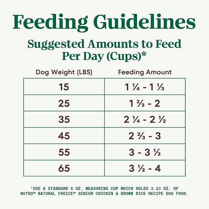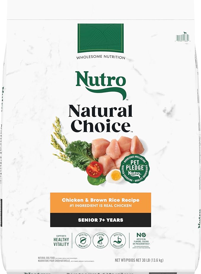 • Contains one (1) 30 lb. bag of NUTRO NATURAL CHOICE Senior Dry Dog Food, Chicken & Brown Rice Recipe for senior dogs ages 7 and older; real chicken is the #1 ingredient