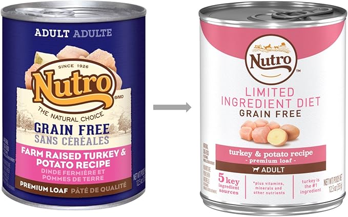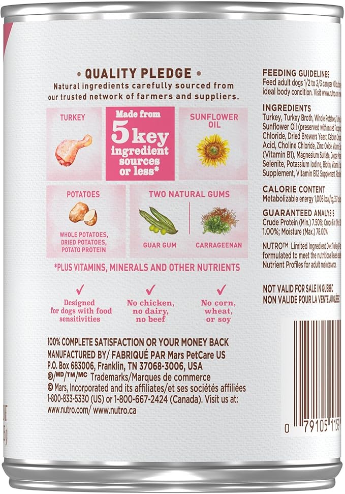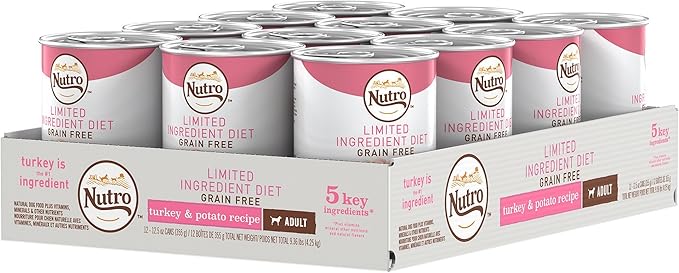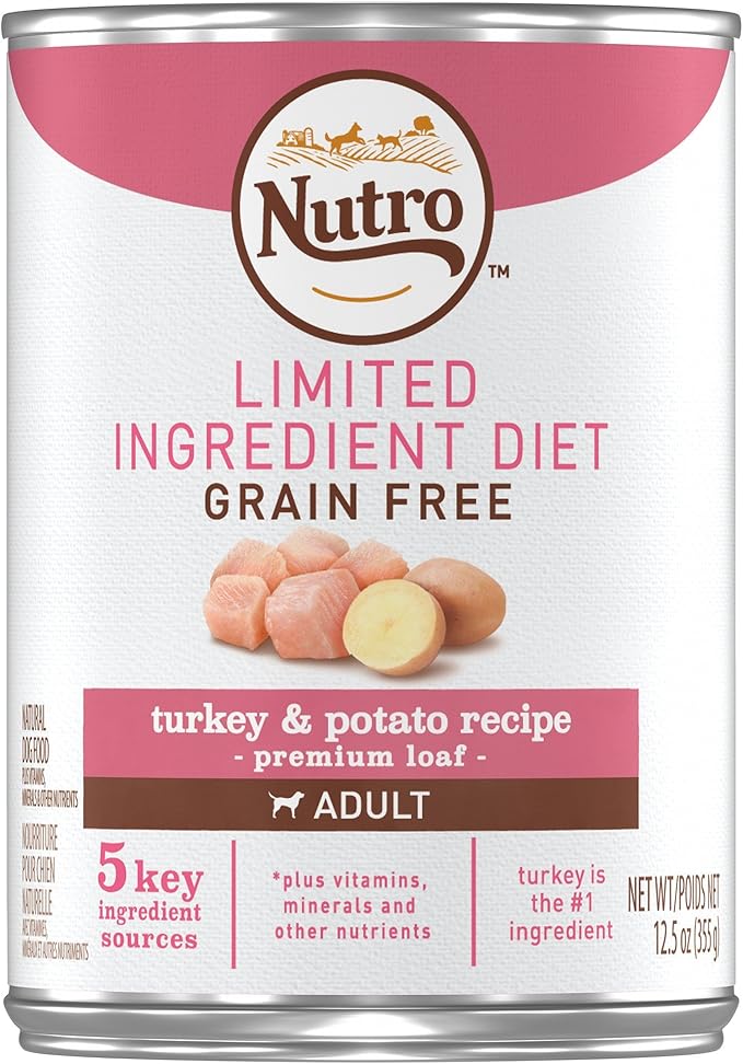 • Contains twelve (12) 12.5 oz. cans of NUTRO Limited Ingredient Diet Premium Loaf Turkey & Potato Recipe Adult Canned Wet Dog Food.