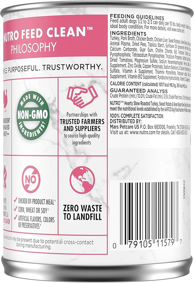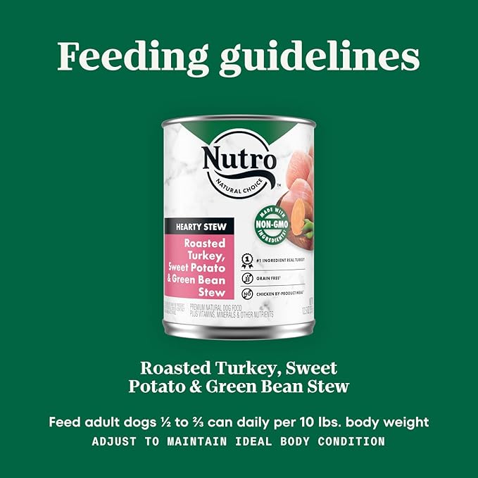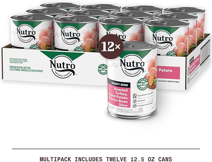 • Pack of 12 Cans: Contains twelve (12) 12.5 oz. cans of NUTRO HEARTY STEW Adult Natural Grain Free Wet Dog Food Cuts in Gravy Roasted Turkey, Sweet Potato & Green Bean Stew