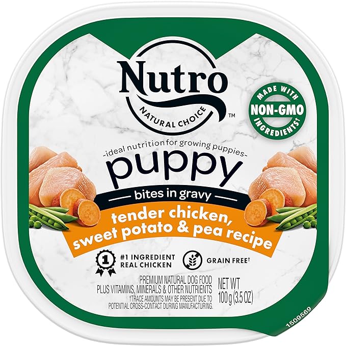 NUTRO PUPPY Grain Free Natural Wet Dog Food Bites in Gravy, Tender Chicken, Sweet Potato & Pea Recipe, 3.5 oz. Trays (Pack of 24)