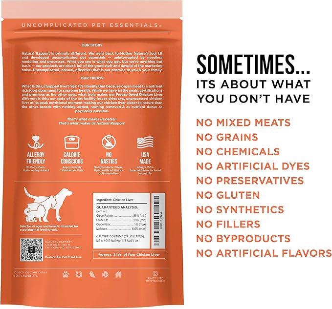 • FLAVORFUL - Our chicken liver treats are full of natural, chicken liver flavor pets love and pet owners trust. Trade in the peanut butter flavored treats for Natural Rapport chicken treats. Each 8 oz. pouch contains about 240 treats, two pounds of meat!