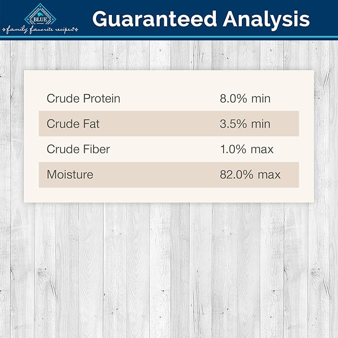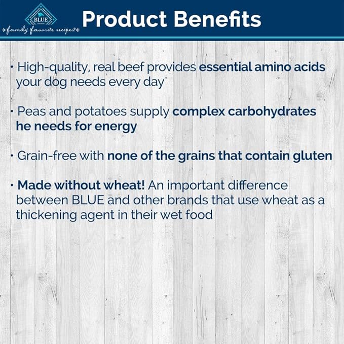 • WHOLESOME INGREDIENTS: BLUE wet dog food contains NO chicken (or poultry) by-product meals, NO corn, wheat (a common thickening agent used by other brands) or soy, and NO artificial flavors or preservatives