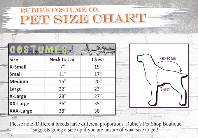 • READ BEFORE SELECTING SIZE! Do not buy based on breed; consult the Rubie’s Pet Size Chart and watch the measuring instruction video