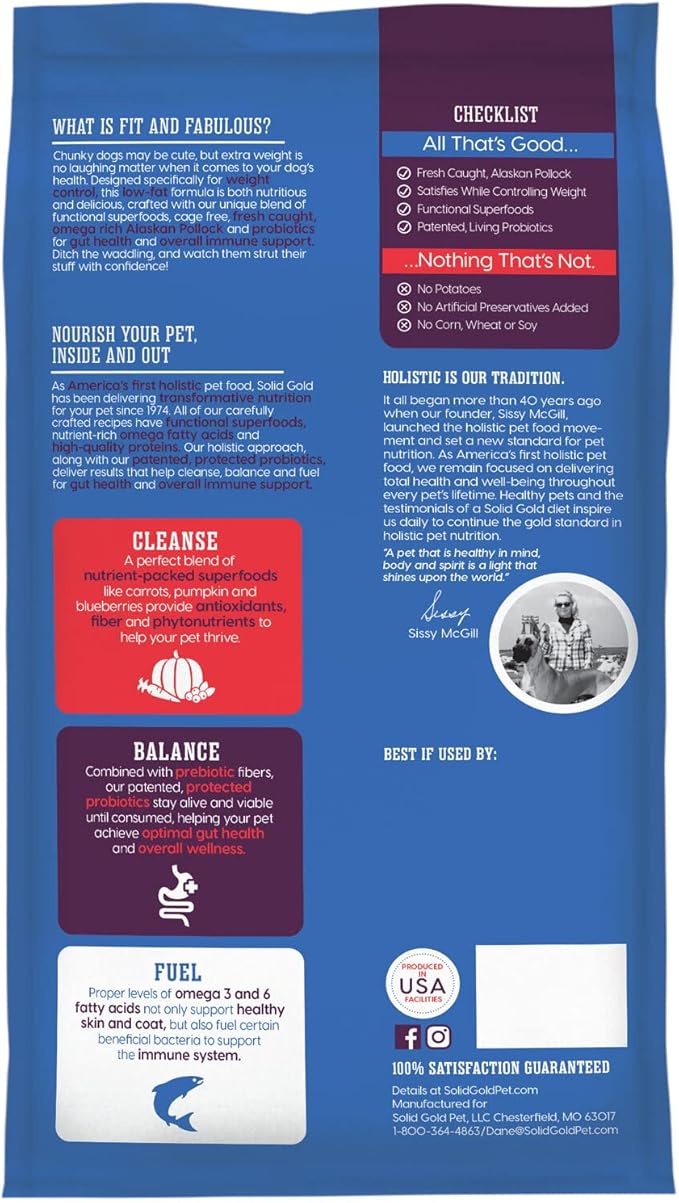 • Treat Your Dog to Something Fab! - Solid Gold Fit and Fabulous weight control dog food is a gluten free dog food that supports gut, immune, skin, and coat health for any adult breed.