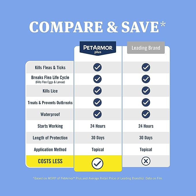 • Easy-to-use, Long-Lasting: PetArmor Plus flea and tick treatment comes with three (3) waterproof topical applications that provide your pet flea protection and control for three (3) months, or one year