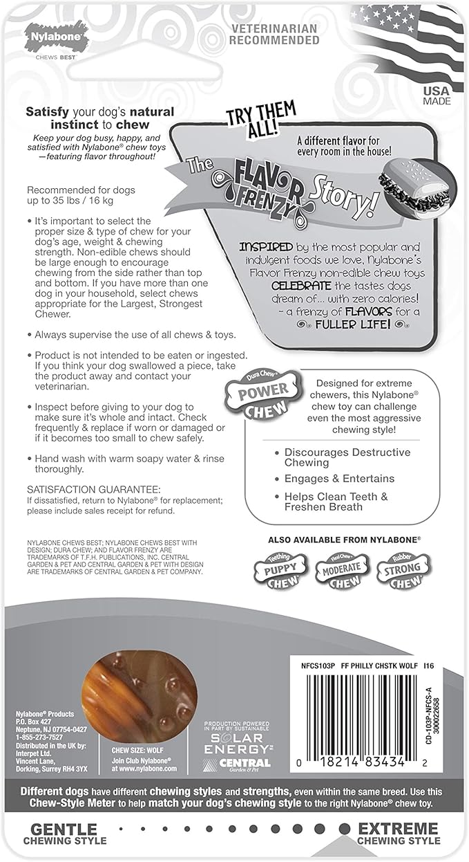 Nylabone Power Chew Flavor Frenzy Dental Bone Chew Toy for Dogs, Indestructible Chew Toys for Aggressive Chewers, Philly Cheesesteak Flavor, Medium/Wolf - Up to 35 lbs. (1 Count)