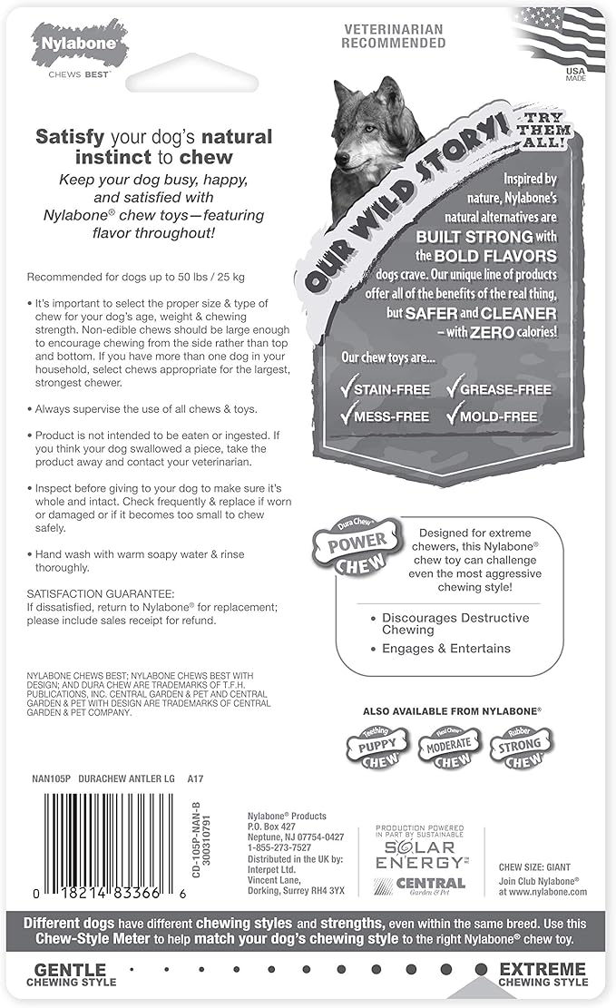 Nylabone Power Chew Antler Alternative Nylon Chew Toy for Dogs, Dog Toys for Aggressive Chewers, Venison Flavor, Large/Giant (1 Count)