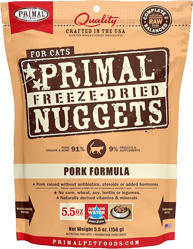 Primal Freeze Dried Cat Food Nuggets Pork; Complete & Balanced Meal or Topper; Premium, Healthy, Grain Free, High Protein Raw Cat Food with Probiotics (5.5 oz)