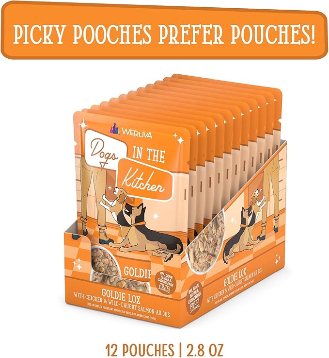 • Goldie Lox (2.8oz Pouch, Pack of 12) Featuring boneless, shredded chicken, wild-caught salmon, and mackerel in gravy. Picky Pooches Prefer Pouches!