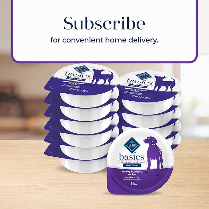 • Contains: One (1) 3.5-oz. cups. of BLUE Basics Skin & Stomach Care Small Breed Adult Grain-Free Wet Dog Food, Turkey & Potato Recipe