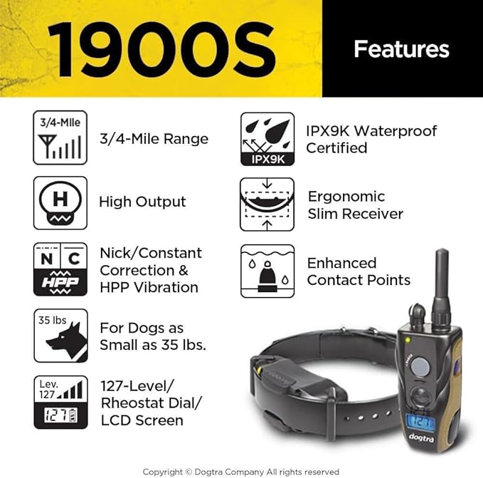 Dogtra 1900S Ergonomic 3/4-Mile IPX9K Waterproof High-Output Remote Dog Training E-Collar