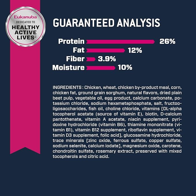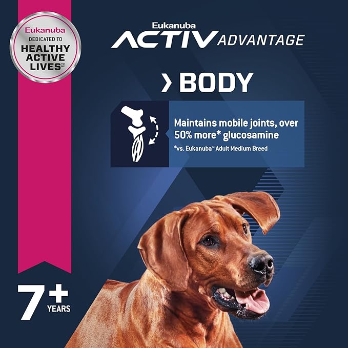 • Helps keep joints mobile and supports lean muscles in active seniors with chondroitin sulfate and 50% more glucosamine (vs. Eukanuba Adult Medium Breed dry dog food)