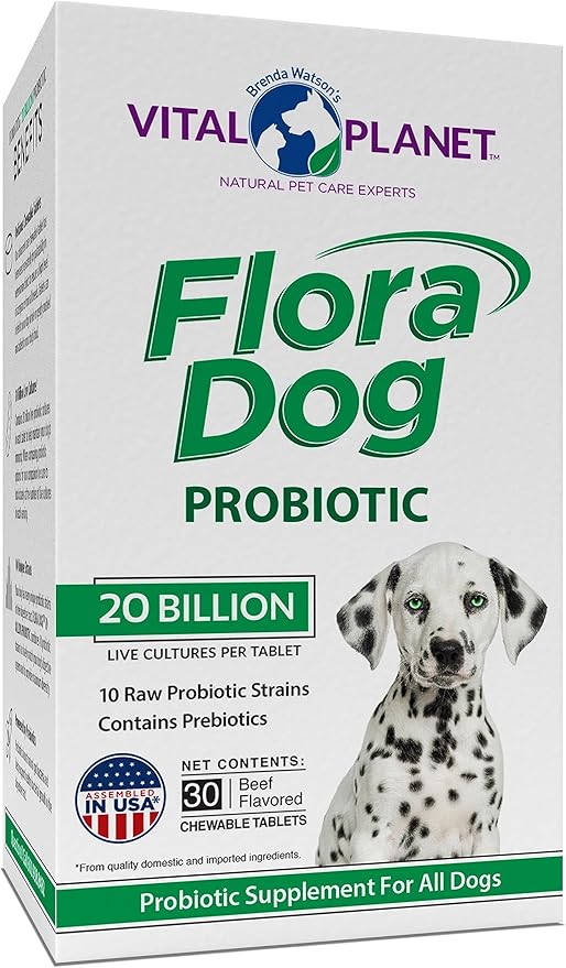 Vital Planet - Flora Dog Probiotic Chewable Tablets Supplement with 20 Billion Cultures and 10 Strains, High Potency Immune and Digestive Support Probiotics for Dogs, 30 Beef Flavored Chewable Tablets