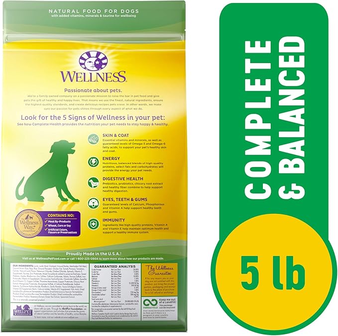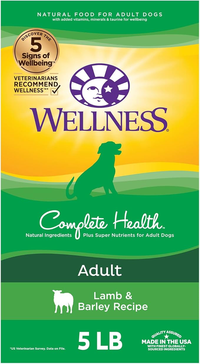 Wellness Complete Health Dry Dog Food with Grains, Natural Ingredients, Made in USA with Real Meat, All Breeds, For Adult Dogs (Lamb & Barley, 5-Pound Bag)