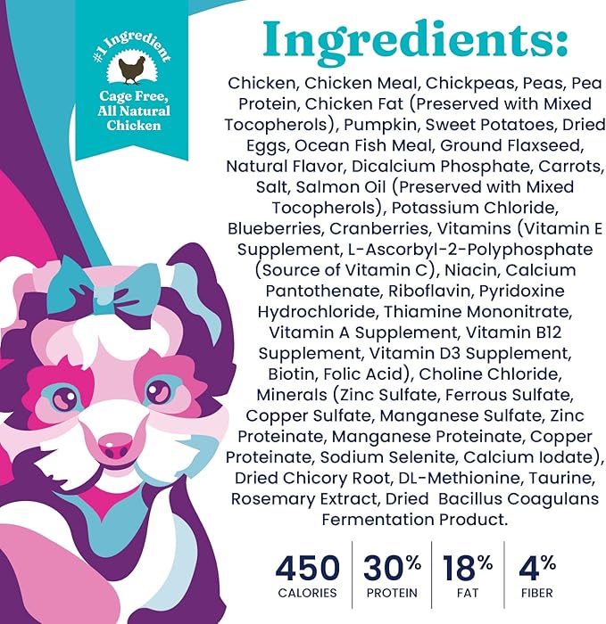 • High Protein Dog Food & No Junk - This kibble dog food provides high protein for dogs from cage free chicken for muscle support and contains no corn, wheat, soy, artificial colorings or preservatives.