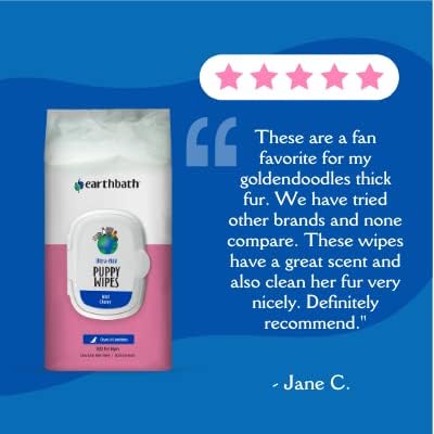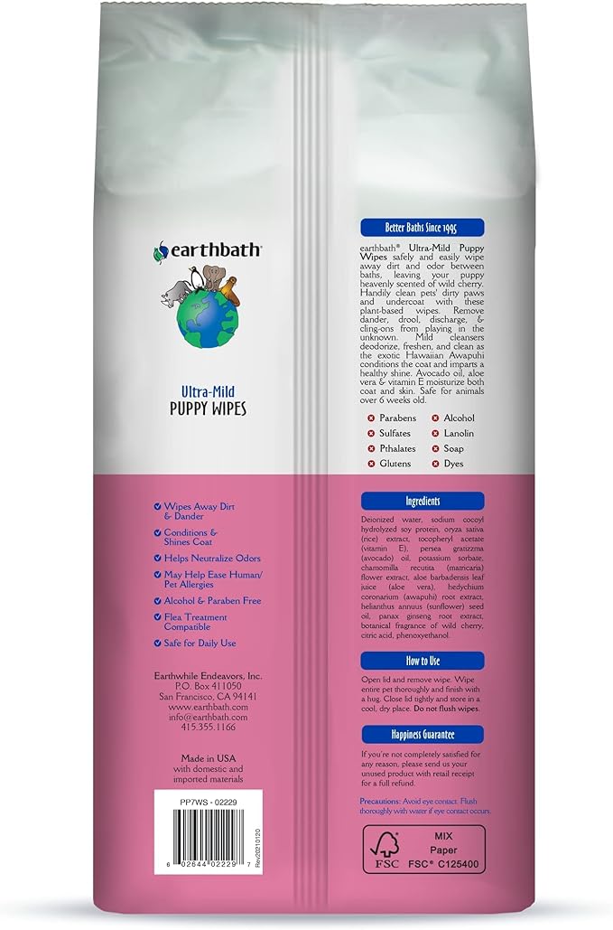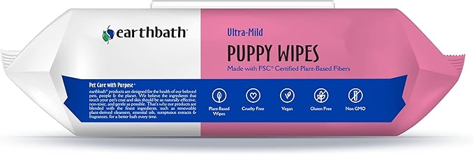 earthbath, Ultra-Mild Wild Cherry Puppy Wipes - Dog Wipes for Paws and Butt, Best Pet Wipes for Dogs & Puppies, Made in USA, Cruelty-Free Dog Cleaning Wipes - 100 Count (2 Pack)