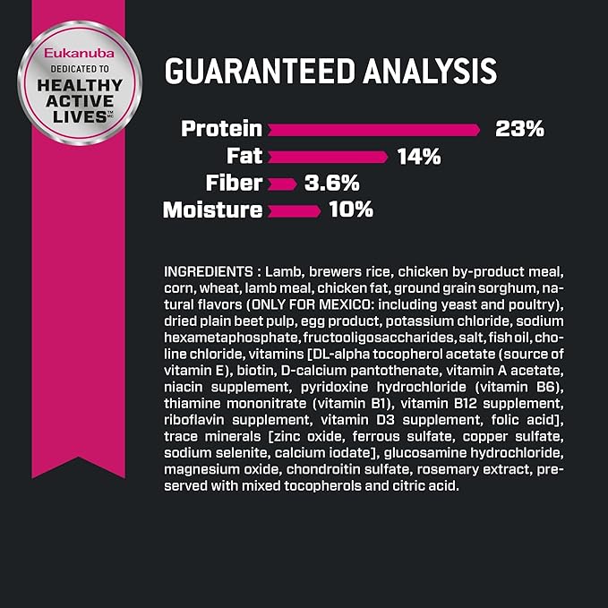 • Eukanuba Adult Lamb 1st Ingredient dry dog food is complete and balanced nutrition for small and medium breed dogs over 12 months old and weighing up to 54 lbs.