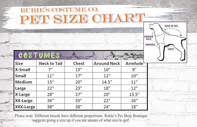 • READ THE RUBIE’S PET SIZE CHART and WATCH THE SIZING INSTRUCTION VIDEO, do not select size based on breed; consider costume style and animal shape before ordering