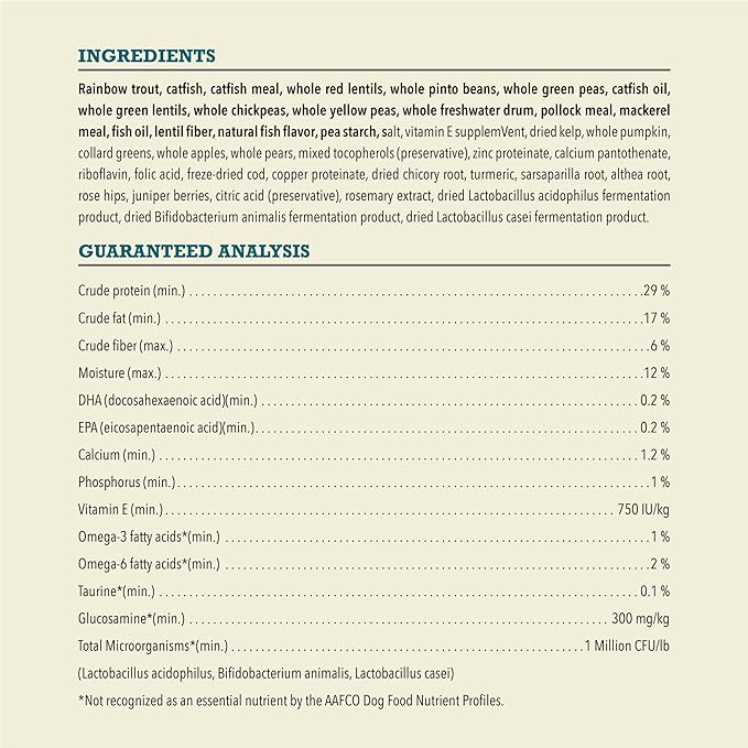 • High protein dog food recipe features raw rainbow trout, catfish & freshwater drum and is balanced to include 60 percent** high-quality animal ingredients and 40 percent*** wholesome fruit, vegetables and nutrients