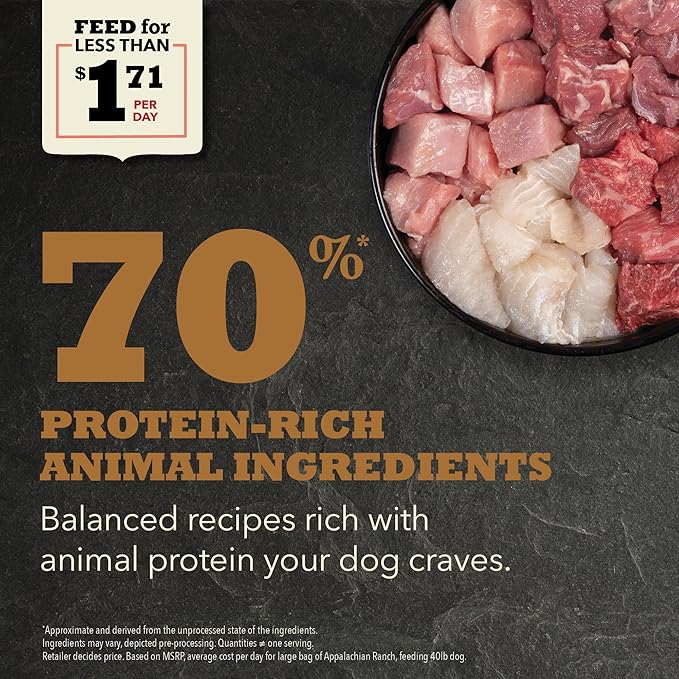 • High protein dog food recipe features Fresh or Raw*** Ranch-Raised Meats and Freshwater Catfish and is balanced to include 70 percent** high-quality animal ingredients and 30 percent*** wholesome fruit, vegetables and nutrients