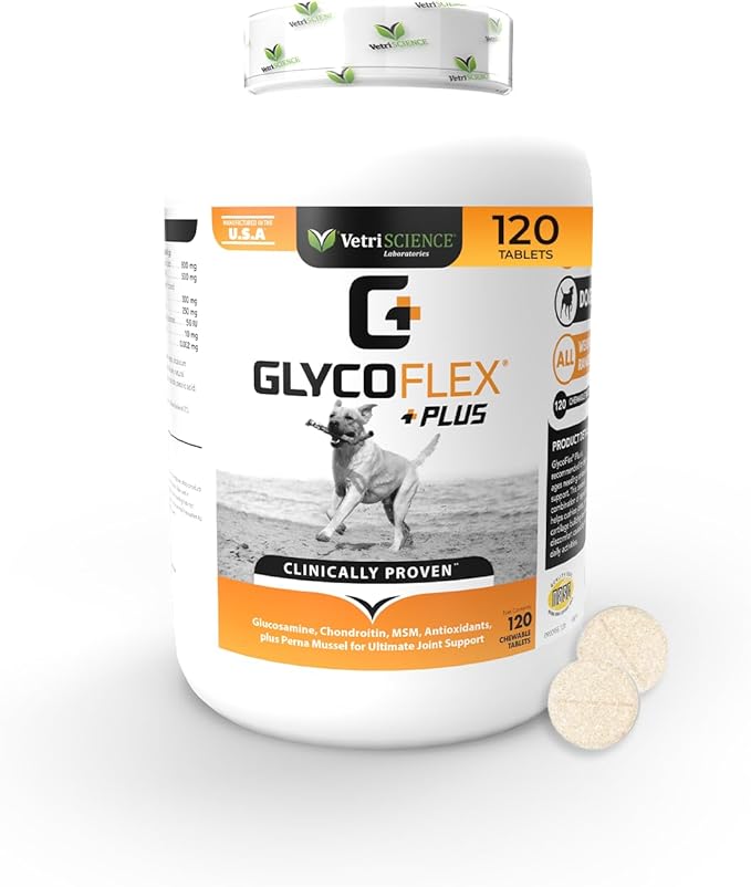 VetriScience GlycoFlex Plus Hip and Joint Supplement for Dogs, Chewable Tablet – Extra-Strength Joint Support with Green Lipped Mussel, Chondroitin, and Glucosamine for Dogs