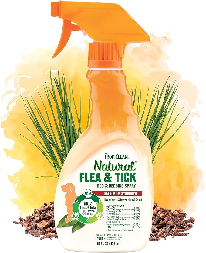 TropiClean Natural Flea and Tick Spray for Dogs & Bedding | Maximum Strength Flea Spray for Home | Family Friendly & Safe | Made in the USA | 16 oz.