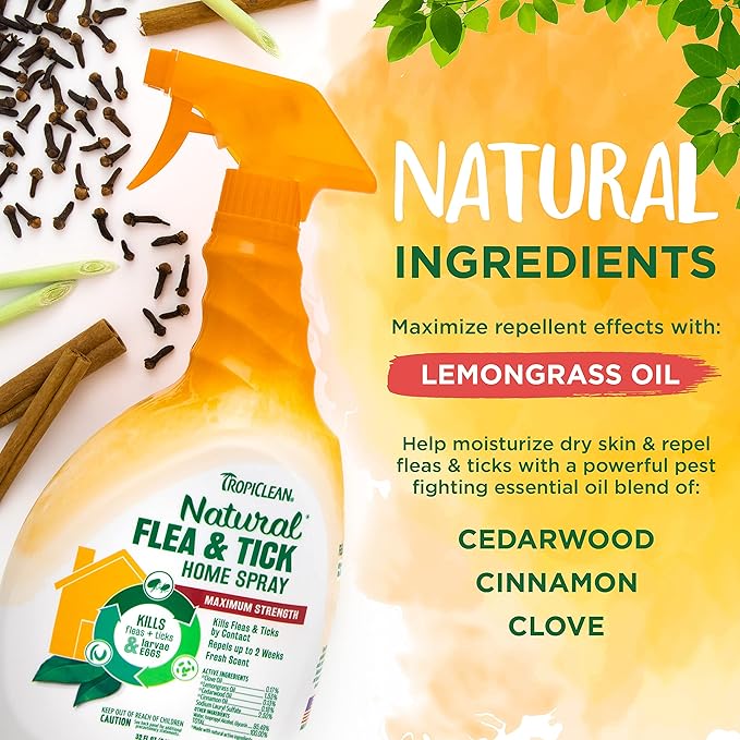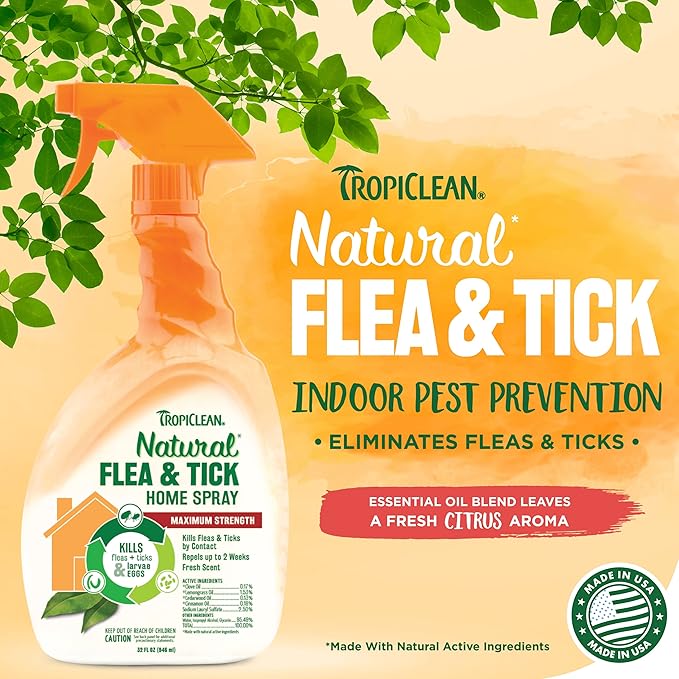 TropiClean Natural Flea and Tick Spray for Home | Maximum Strength Flea Spray for Carpet and Furniture | Family-Friendly & Safe | Made in the USA | 32oz