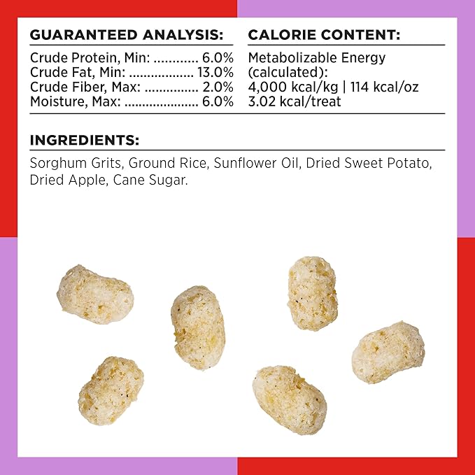 • WHEAT FREE TRAINING TREATS FOR DOGS: Sweet potato and apple flavored crunchy dog treats made with a healthy blend of pearled sorghum, rice, and non-GMO sunflower oil