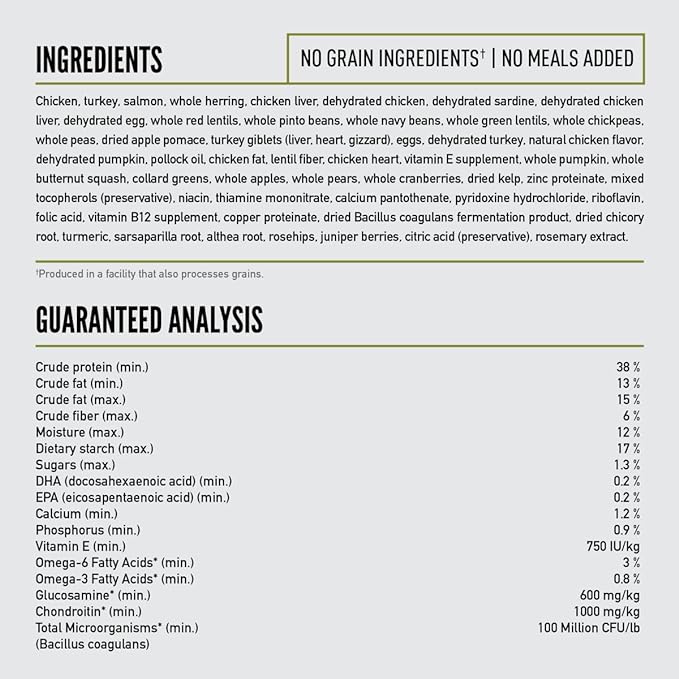 • The first five ingredients are fresh or raw chicken, turkey, salmon, whole herring and chicken liver to provide your dog with a strong source of protein, vitamins and minerals