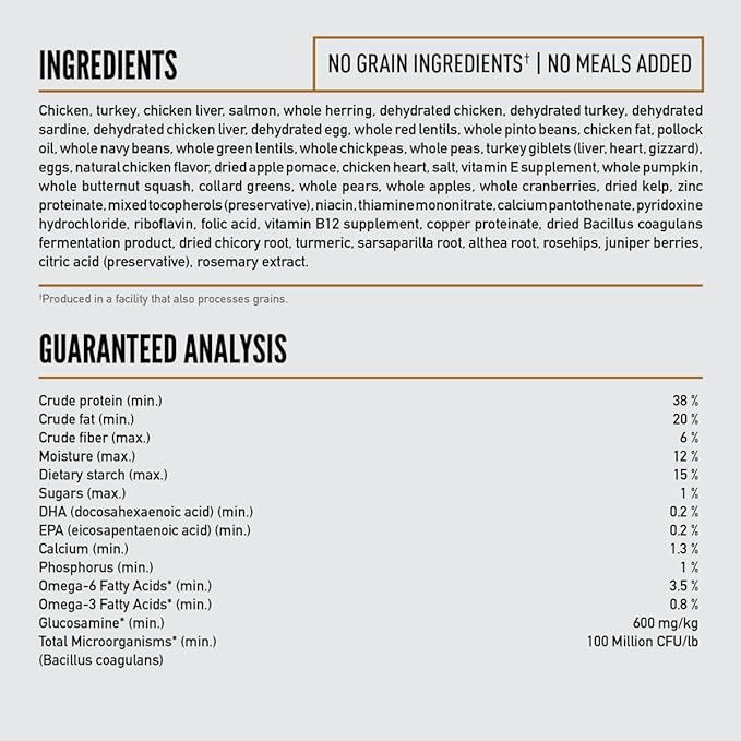• Using fresh and raw animal ingredients, including meat, organs, cartilage, and bone, ORIJEN is the Biologically Appropriate, grain-free diet that dogs have evolved to eat