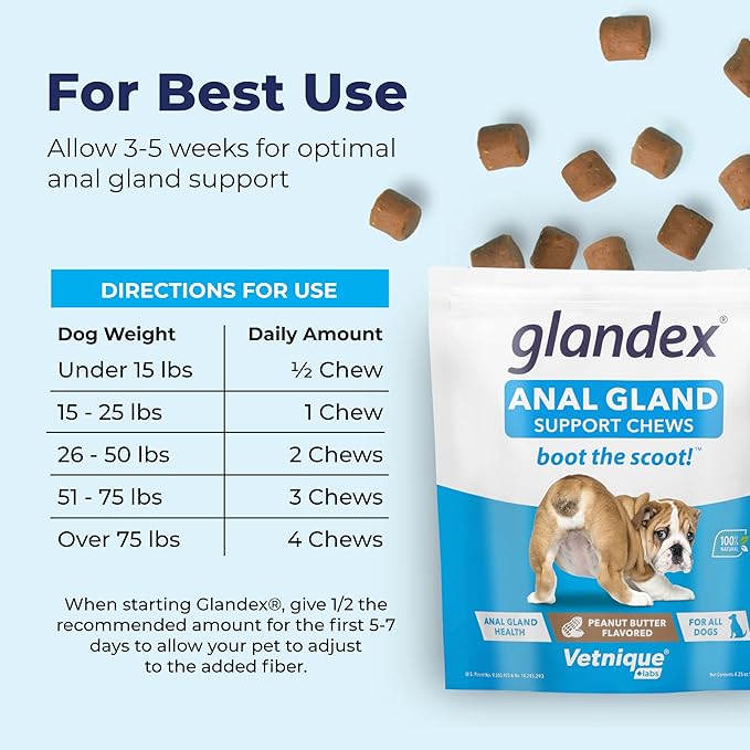 • GUARANTEED TO BOOT THE SCOOT: Glandex results are guaranteed to help your pet "Boot the Scoot!” in 3-5 weeks & comes with a 100% satisfaction guarantee.