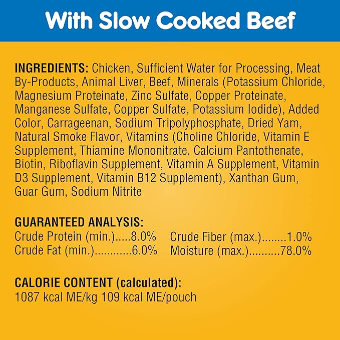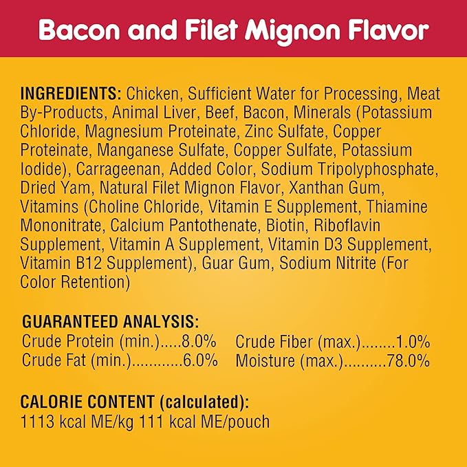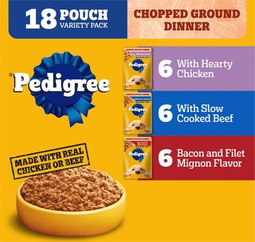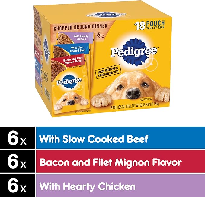 • VARIETY PACK CONTAINS EIGHTEEN (18) 3.5 oz. pouches of PEDIGREE CHOPPED GROUND DINNER Adult Wet Dog Food: (6) Bacon and Filet Mignon Flavor (6) With Slow Cooked Beef (6) With Hearty Chicken