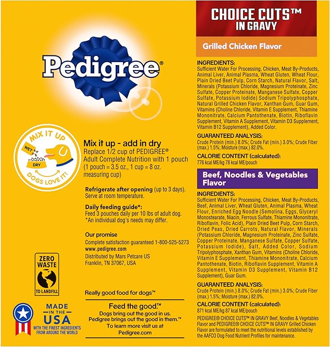 • Contains sixteen (16) 3.5 oz. pouches in PEDIGREE CHOICE CUTS in Gravy Wet Dog Food Variety Pack: (8) Beef Noodles & Vegetables Flavor in Sauce and (8) Grilled Chicken Flavor in Sauce
