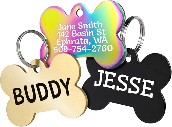 GoTags Dog Tags, Personalized Engraved Dog and Cat ID Tags for Pets, Custom Engraved on Both Sides, Stainless Steel, Rainbow Steel, Black Steel or Solid Brass, Bone Shape Dog ID Tags (Pack of 1)