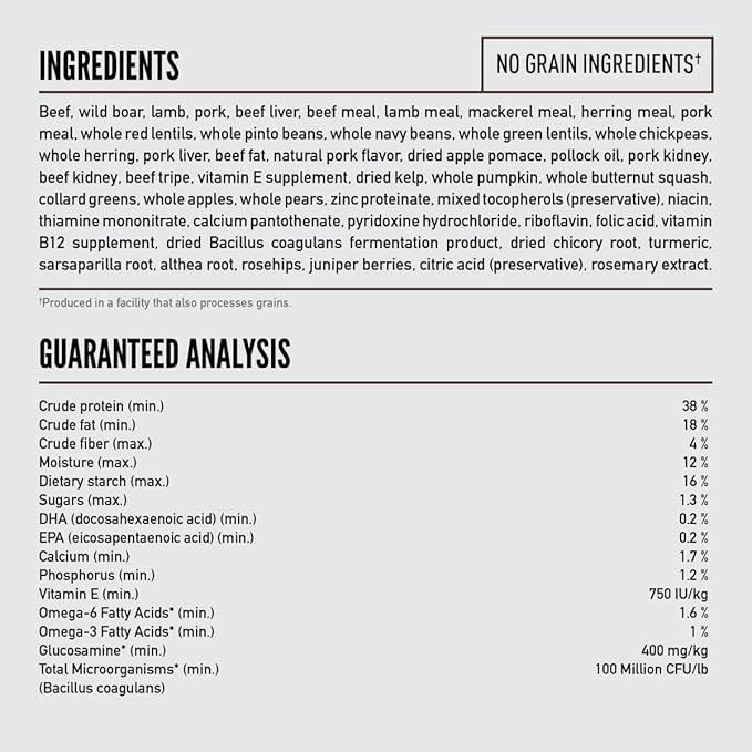 • The first five ingredients are fresh or raw farm-raised beef, wild boar, lamb, pork and beef liver to give your dog a strong daily source of protein, vitamins and minerals