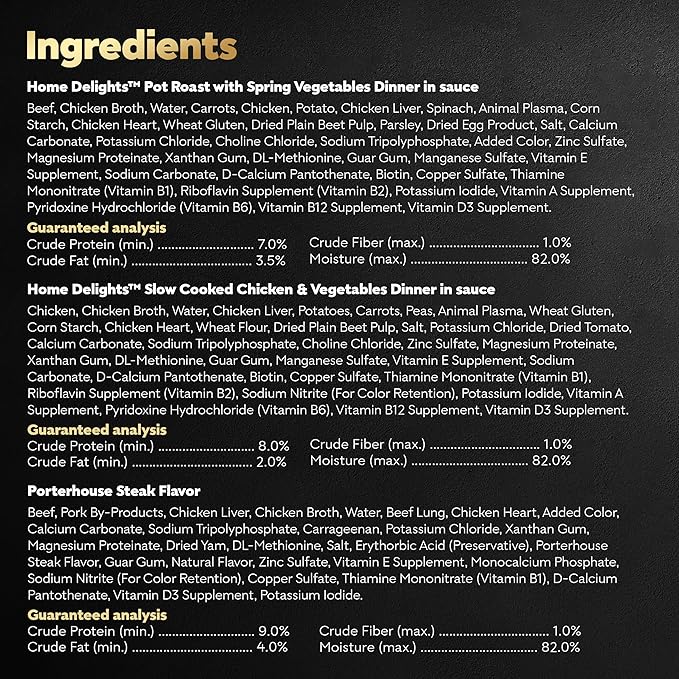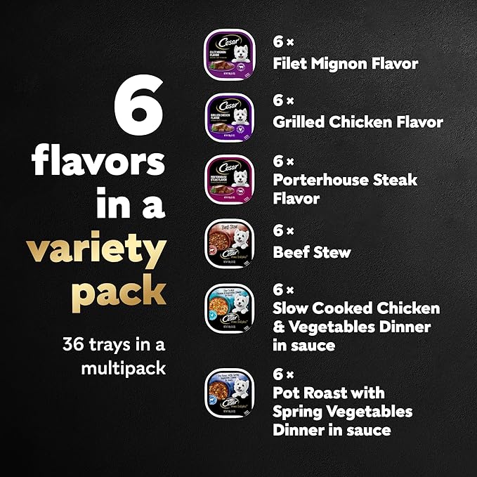 • 36-Pack: Contains eighteen (18) 3.5 oz. packs of CESAR HOME DELIGHTS and eighteen (18) 3.5 oz. packs of Loaf and Sauce Adult Wet Dog Variety Pack