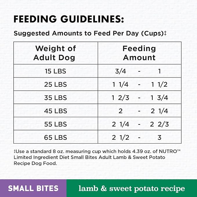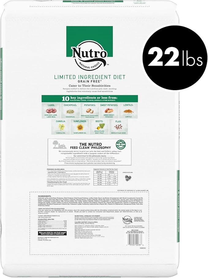 • Contains one (1) 22 lb. bag of NUTRO Limited Ingredient Diet Small Bites Adult Dry Dog Food Lamb & Sweet Potato.
