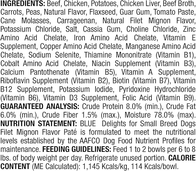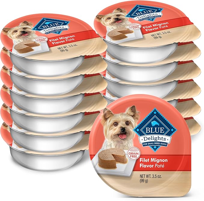 • Contains twelve (12) 3.5-oz BLUE Delights Natural Adult Small Breed Wet Dog Food Cups, Filet Mignon Flavor in Savory Juice