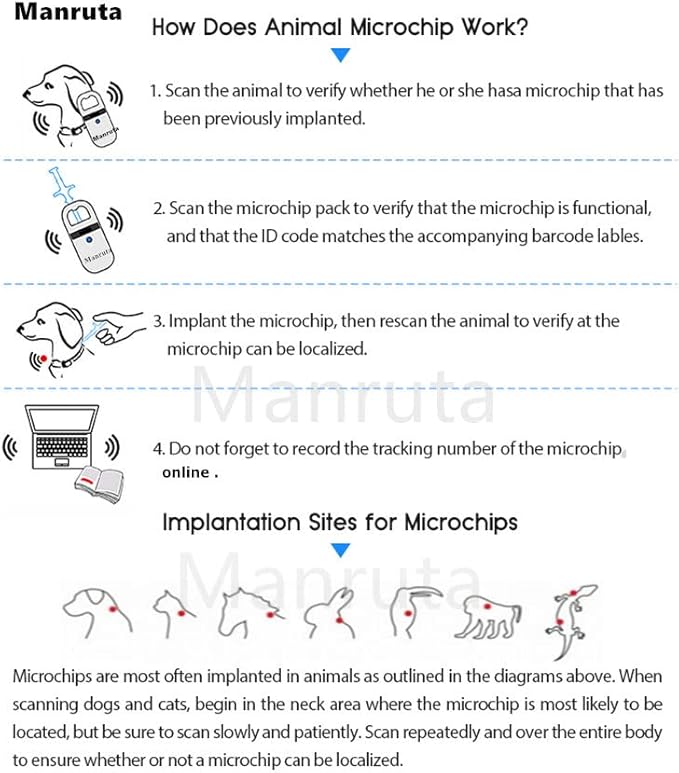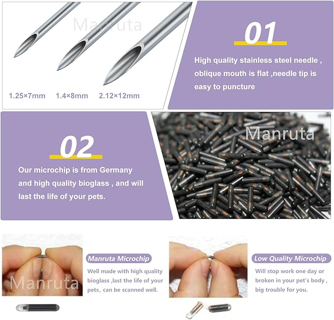 • {MANAGE YOUR PETS} : Keep your pets safe with Manruta Microchips. Our RFID microchip implant Kit gives your pet chance to return home if ever lost or stolen.