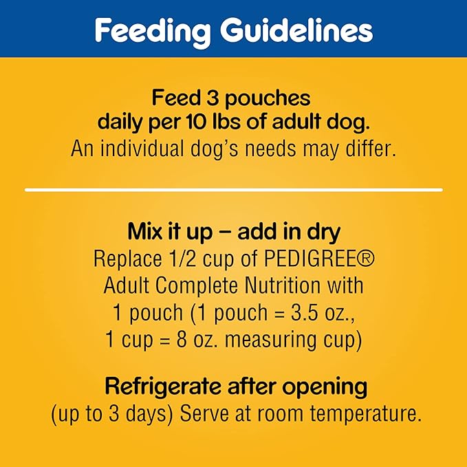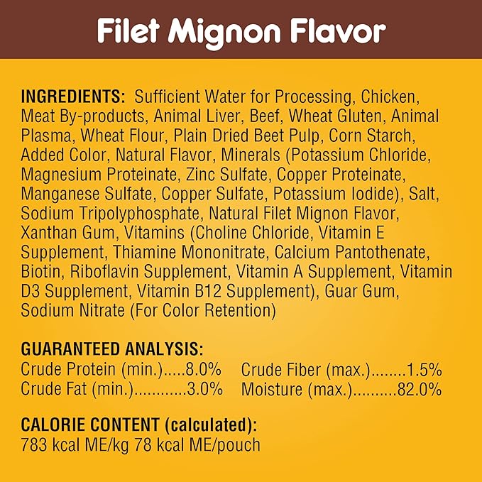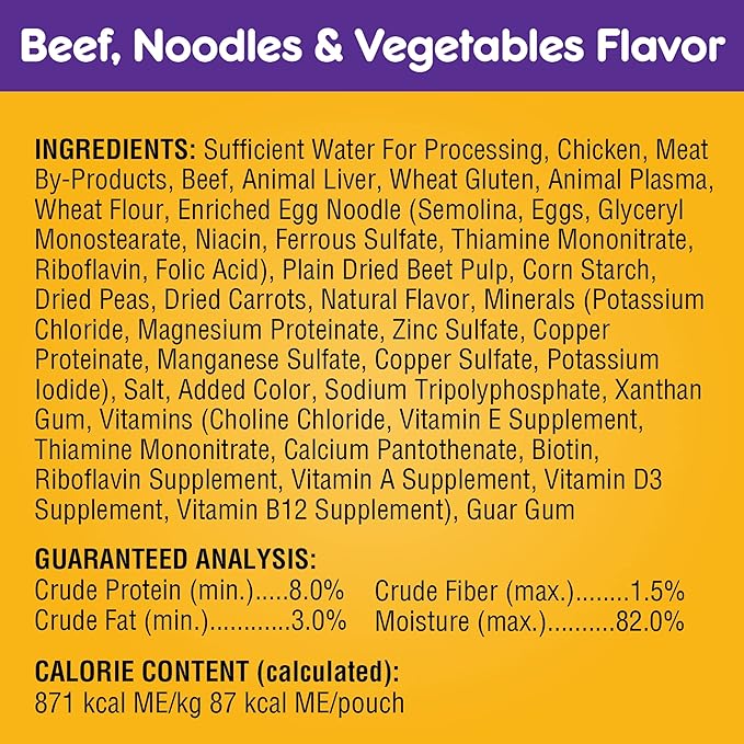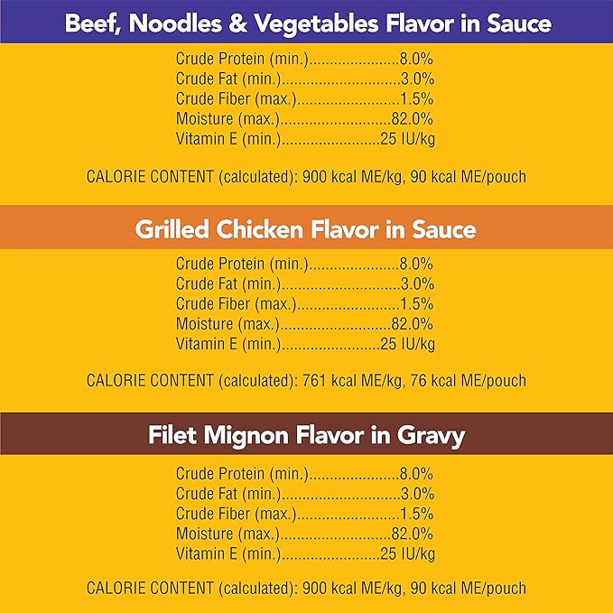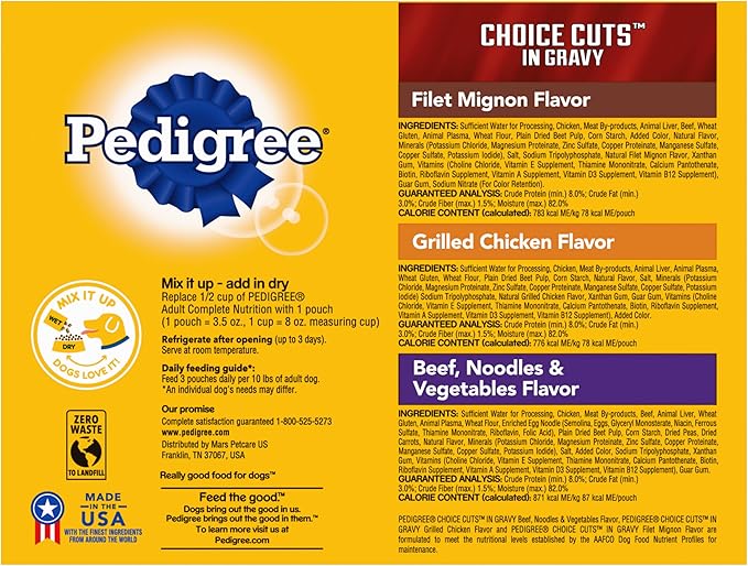 • VARIETY PACK CONTAINS EIGHTEEN (18) 3.5 oz. pouches of PEDIGREE CHOICE CUTS IN GRAVY Wet Dog Food: (6) Filet Mignon Flavor (6) Grilled Chicken Flavor (6) Beef, Noodles & Vegetable Flavor