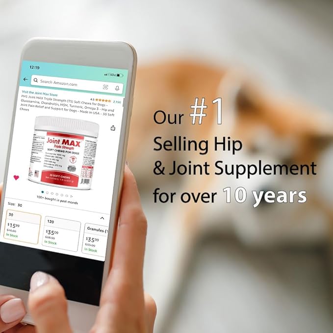 PHS Joint MAX Triple Strength (TS) Soft Chews for Dogs - Glucosamine, Chondroitin, MSM, Turmeric, Omega 3 - Hip and Joint Pain Relief and Support for Dogs - Made in USA - 30 Soft Chews