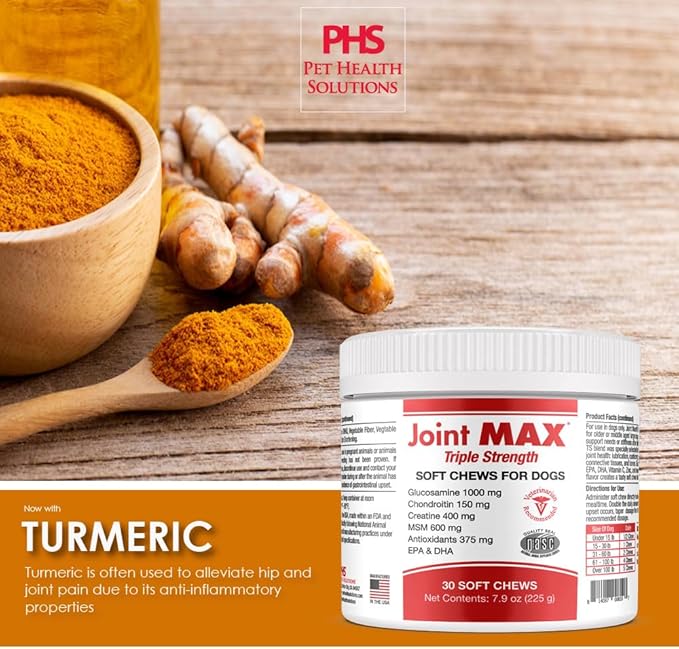 • RELIEF FROM INFLAMMATION - For active dogs or once active dogs that still love to play, Joint MAX Triple Strength uses natural turmeric root to reduce inflammation and relieve joint pain. Your pet will finally rest comfortably after a rough day at the dog park with our super joint enhancer.